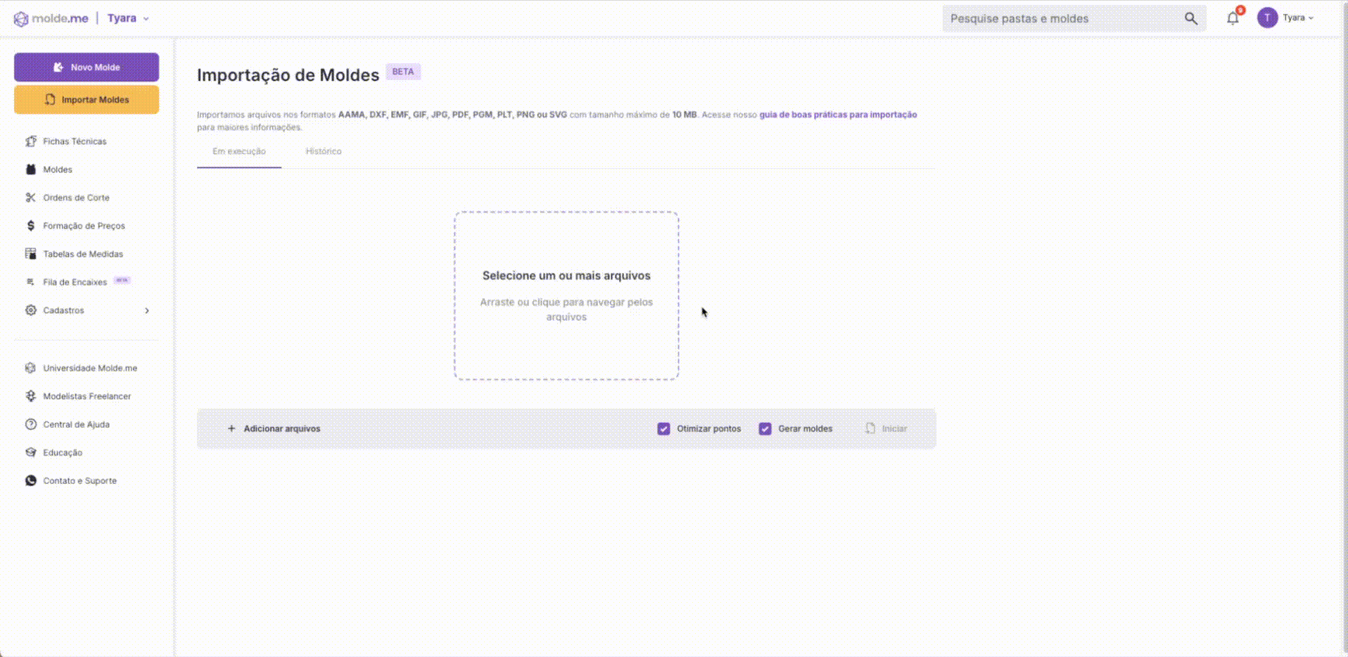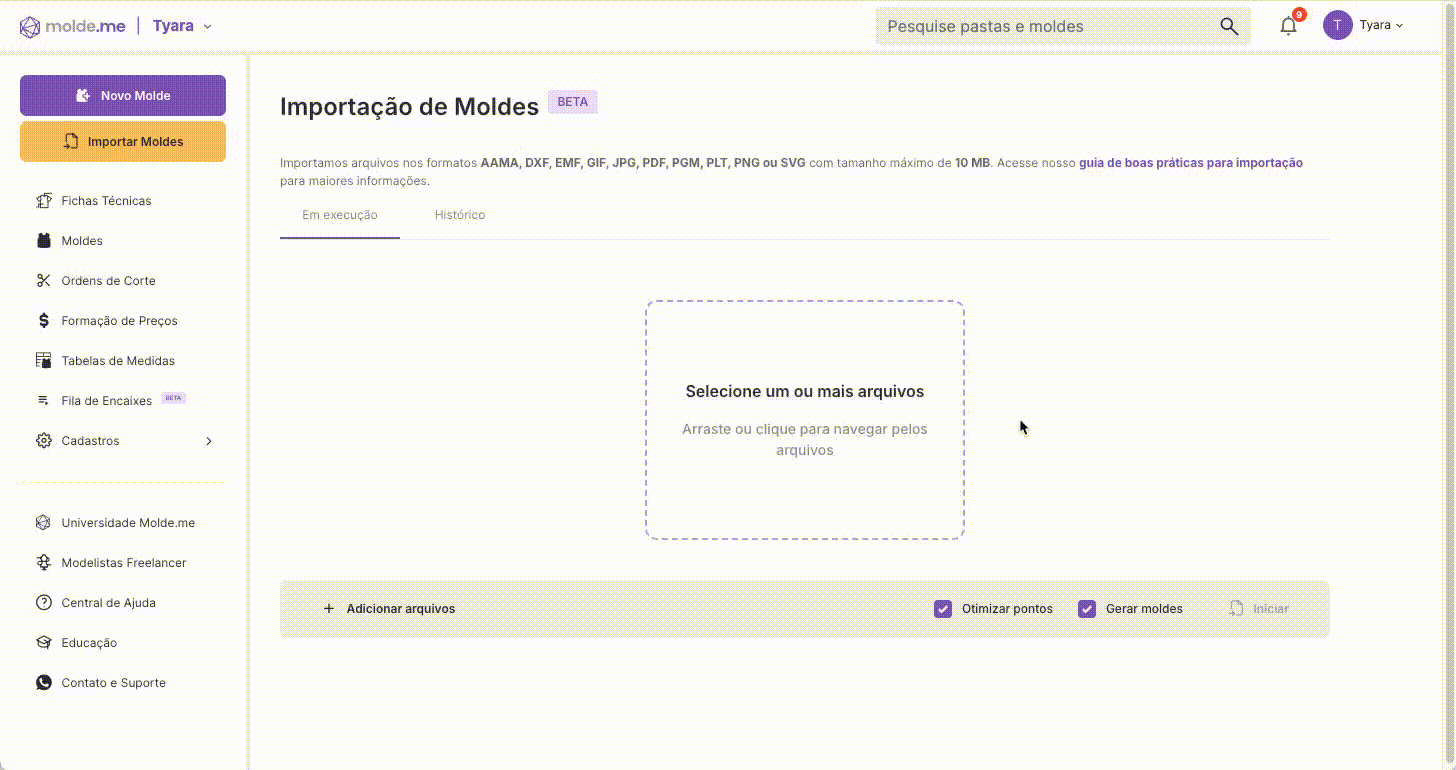 Formatos de arquivos para importar na Molde.me: AAMA, DXF, RUL, EMF, GIF, JPG, PDF, PGM, PLT, PNG ou SVG.