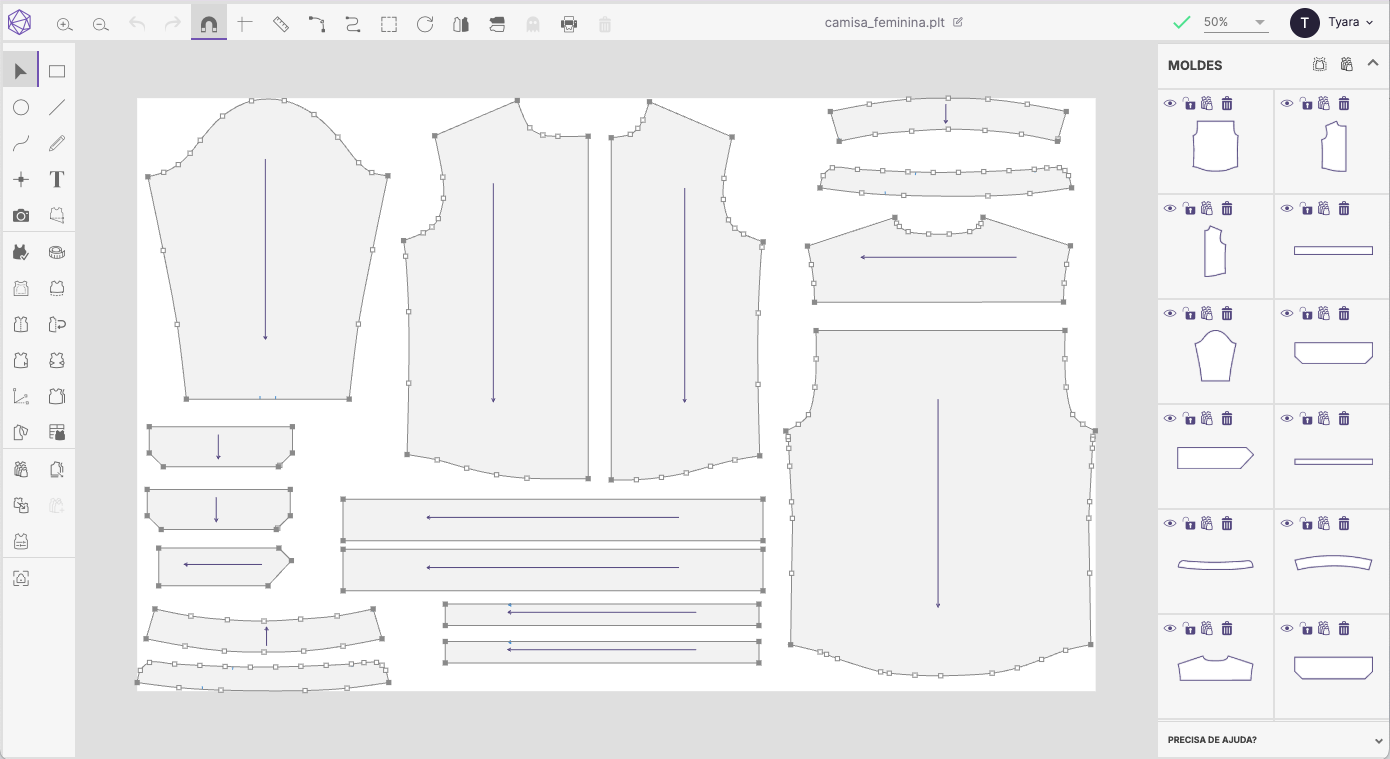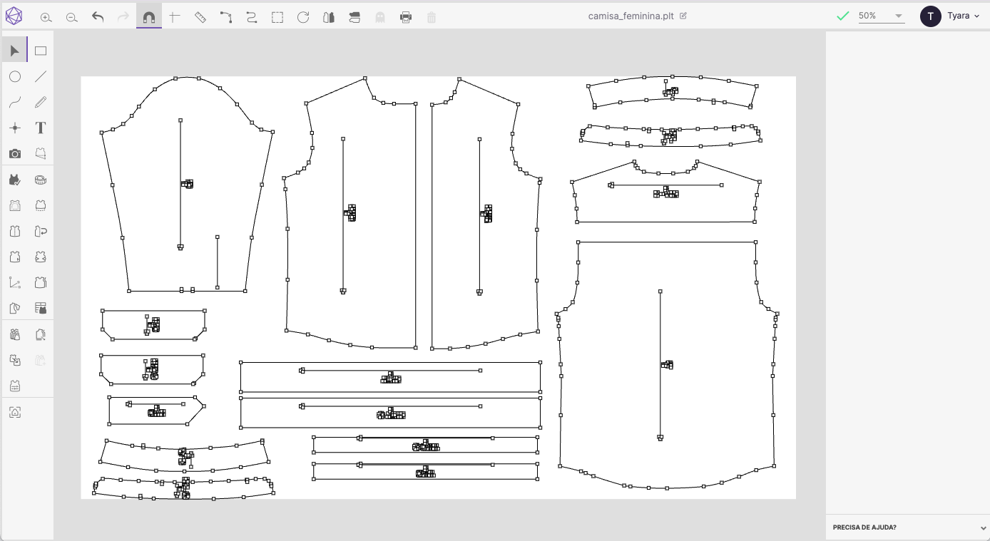 Para conferir as medidas, pode-se utilizar a ferramenta Fita Métrica. Caso o molde não seja exportado em tamanho real temos algumas dicas para redimensionar a modelagem em nosso guia de Boas Práticas de Importação.