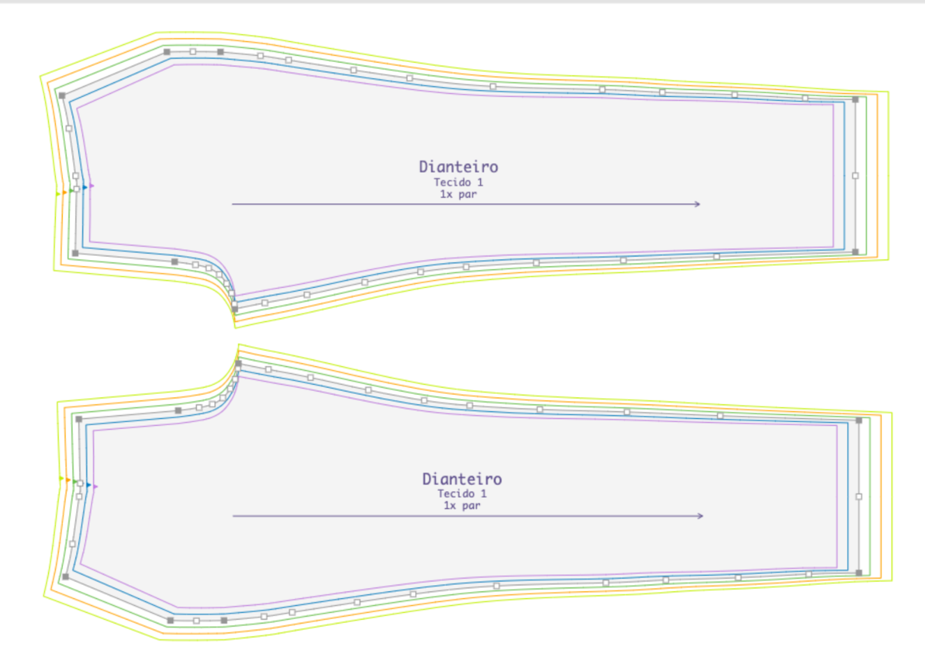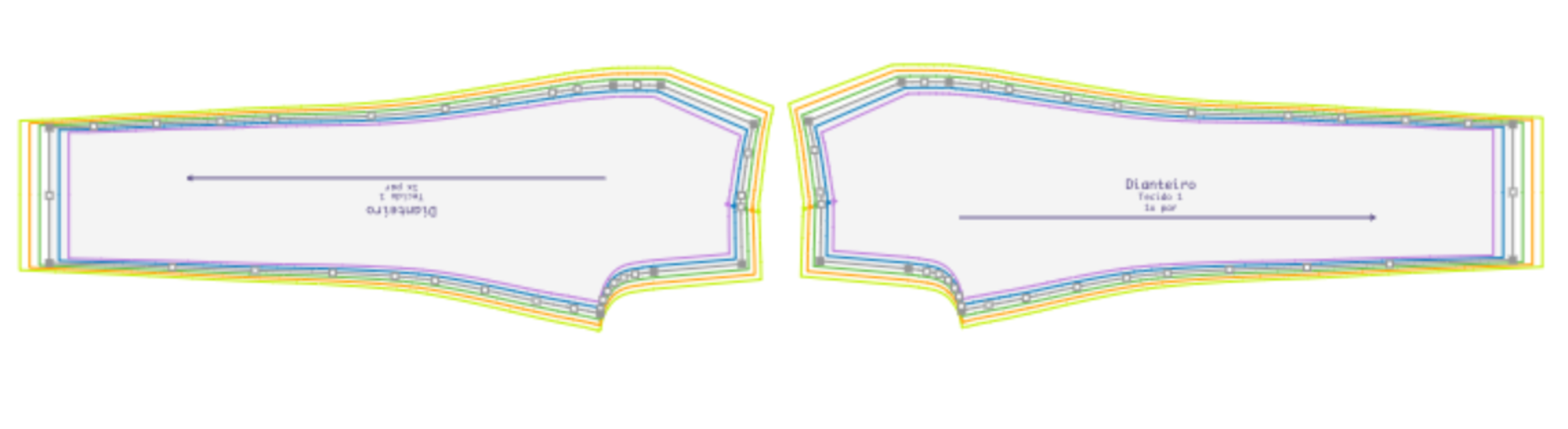 O sistema faz uma cópia automática da peça. Essa cópia é espelhada no eixo horizontal e a montagem da peça segue o padrão tradicional da moda.